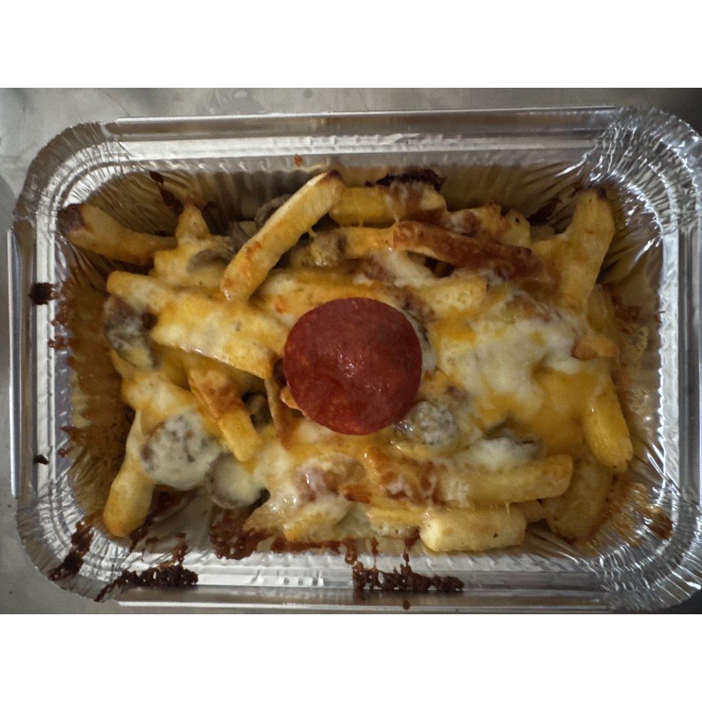 smažené hranolky, kuřecí maso, mozzarella, BBQ omáčka,drobíček červené cibule, chedar.